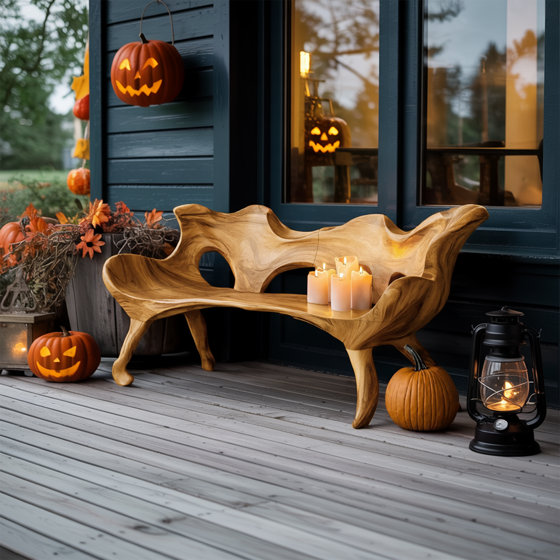 Celebrate the Halloween spirit with a bench that highlights the natural character of wood. Each piece features distinctive knots, live edges, and organic patterns, making your bench truly one of a kind. Its seasonal charm and artisanal details turn your porch or entryway into a warm, inviting space for fall celebrations.