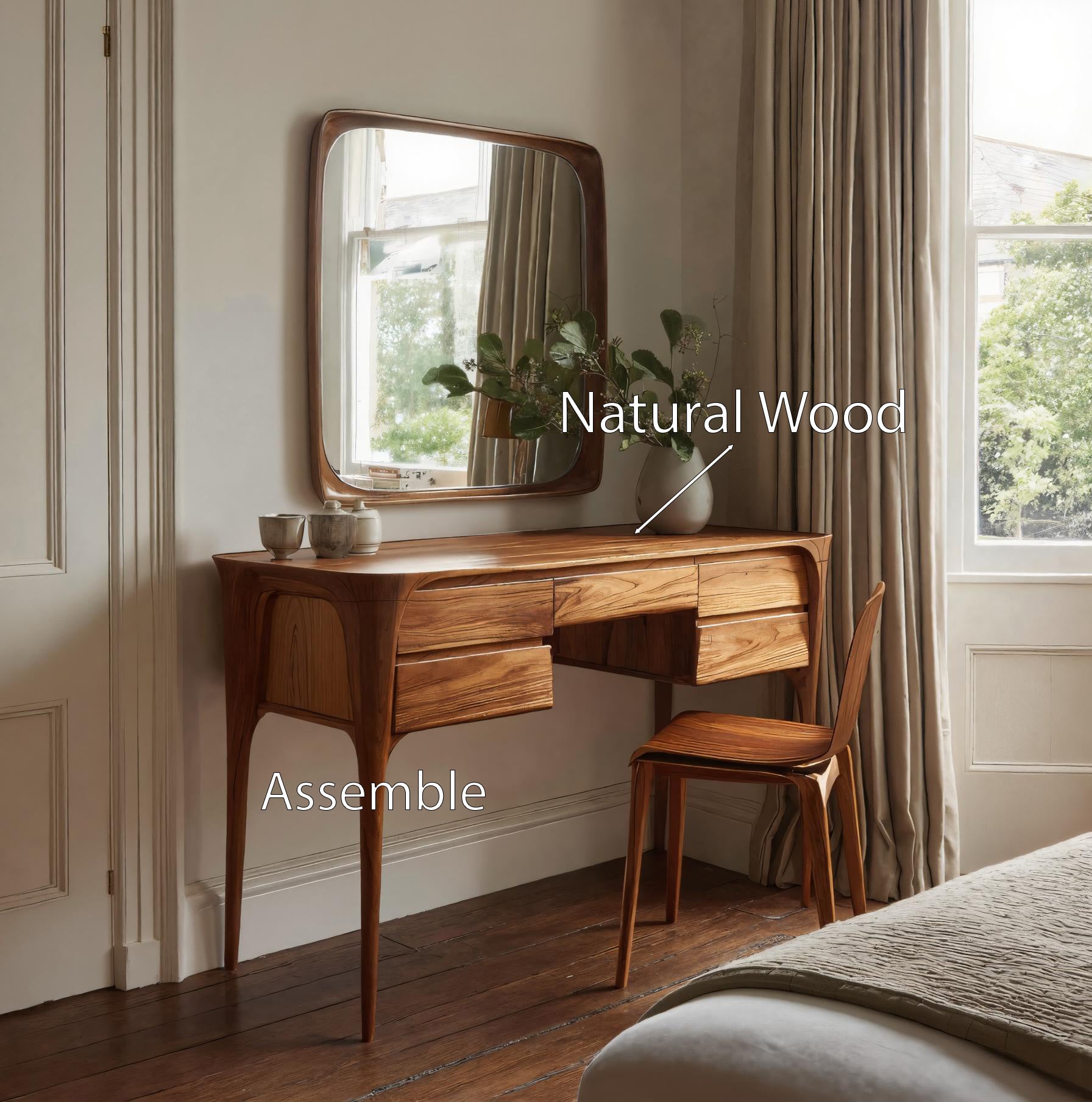 This vanity desk features a graceful silhouette with slender legs and softly rounded edges, showcasing the flowing character of natural wood. Multiple drawers provide practical storage for essentials while maintaining a clean, uncluttered look. Paired with a matching mirror, the design transforms daily rituals into an elevated experience.