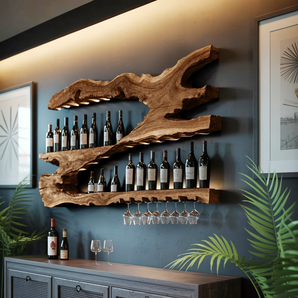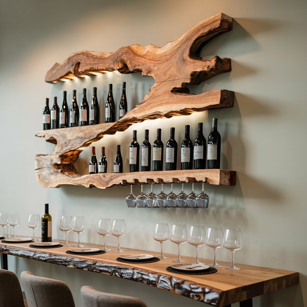 Add a refined touch to your home with the Mid Century Wine Holder For Kitchen Minimalist Shelf, handcrafted from solid Monkeypod wood. With its organic grain and rustic elegance, this piece enhances kitchens, dining rooms, or living areas while providing a functional and stylish way to organize and display your wine collection.